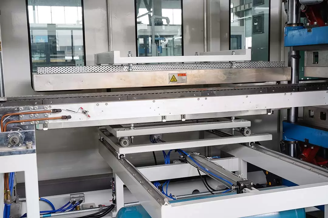 Stasiun pencetakan: Desain cetakan canggih dan teknologi pengepresan memungkinkan lembaran plastik dibentuk secara tepat dalam cetakan, memastikan konsistensi dan kualitas tinggi setiap produk.