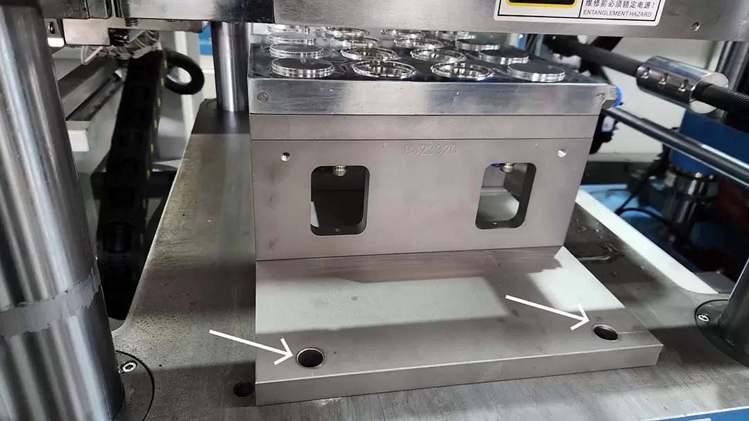 Stasiun pelubangan: Mesin pres menggerakkan pelubang untuk menekan ke bawah dengan cepat dan melubangi produk plastik melalui cetakan pelubangan.