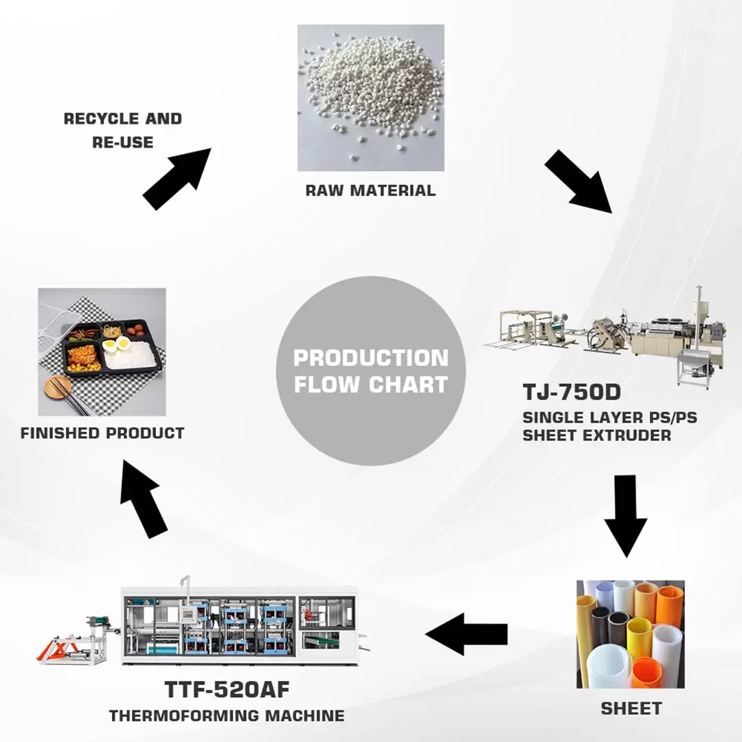 Limbah lembaran yang dihasilkan oleh mesin thermoforming plastik selama proses produksi dapat didaur ulang. Dengan mendaur ulang limbah, pencemaran limbah plastik terhadap lingkungan berkurang, dan beban lingkungan yang disebabkan oleh penimbunan dan pembakaran limbah plastik berkurang.