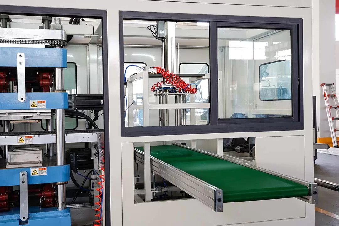 Desain tiga stasiun: Peralatan dilengkapi dengan tiga stasiun kerja: pembentukan, pemotongan, dan penumpukan. Ketiga stasiun bekerja secara bersamaan, yang sangat mempersingkat waktu pembentukan setiap produk dan mewujudkan produksi berkelanjutan berkecepatan tinggi.