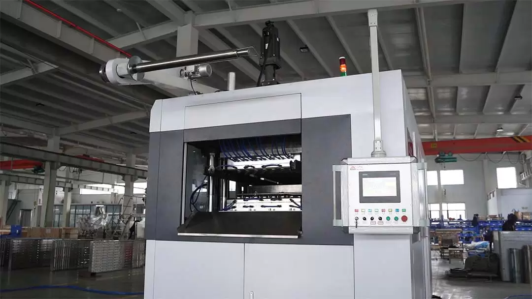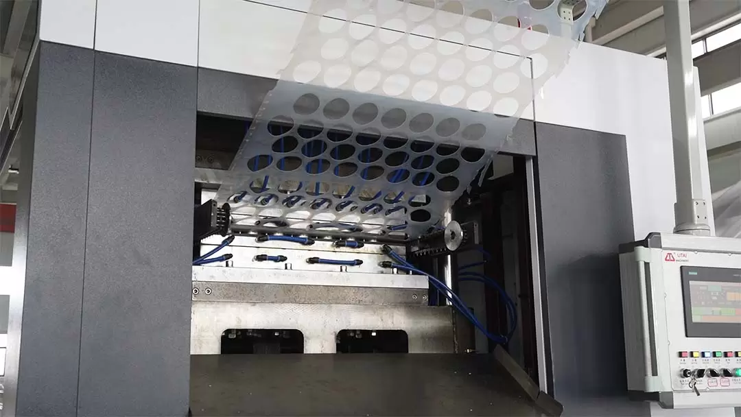 Pemanasan lembaran: Lembaran plastik (seperti PET, PP, PS, dll.) dimasukkan ke area pemanasan dan dipanaskan hingga suhu pelunakan yang sesuai melalui sistem pemanas listrik atau pemanas inframerah.