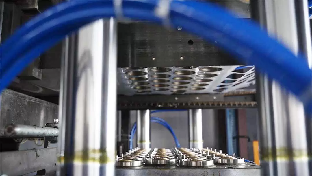 Pendinginan: Cangkir yang sudah dibentuk disimpan dalam cetakan selama beberapa waktu hingga dingin, biasanya menggunakan sistem pendingin air atau pendingin udara untuk memastikan bentuk cangkir stabil.