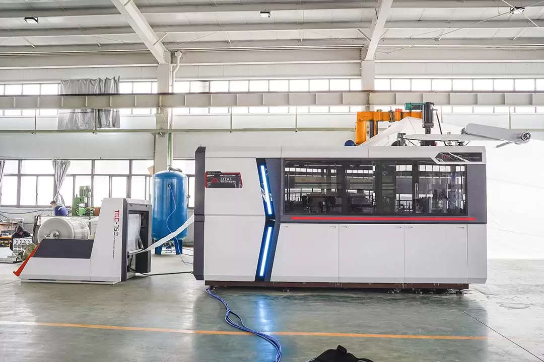 Kontrol Tepat: Dilengkapi dengan sistem kontrol PLC canggih dan antarmuka manusia-mesin, ia dapat secara akurat mengontrol suhu, tekanan, dan waktu pencetakan untuk memastikan kualitas setiap cangkir yang konsisten.