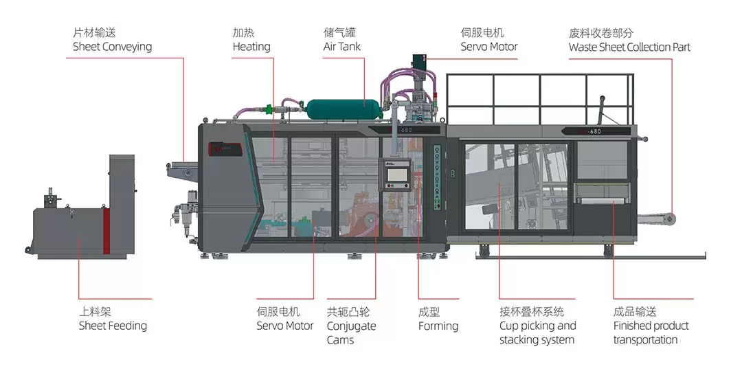 Mesin thermoforming miring gelas plastik TFC-680 adalah produk terbaru yang dikembangkan oleh perusahaan kami, terutama digunakan untuk memproduksi produk gelas plastik dengan spesifikasi yang berbeda. Mesin ini mengadopsi pencetakan tekanan positif dan negatif, dilengkapi dengan sistem pemutar cetakan di bawah kendali motor servo penuh, dan menggunakan dua pasang batang penghubung transmisi cam konjugat untuk menyelesaikan kemiringan, pengangkatan, dan pelubangan meja cetakan. Ini adalah jenis peralatan baru yang dikembangkan untuk output tinggi, konsumsi energi rendah, stabilitas tinggi, otomatisasi tinggi, dan persyaratan lainnya, yang menyediakan solusi sempurna untuk gelas plastik sekali pakai berkapasitas sedang dan tinggi.